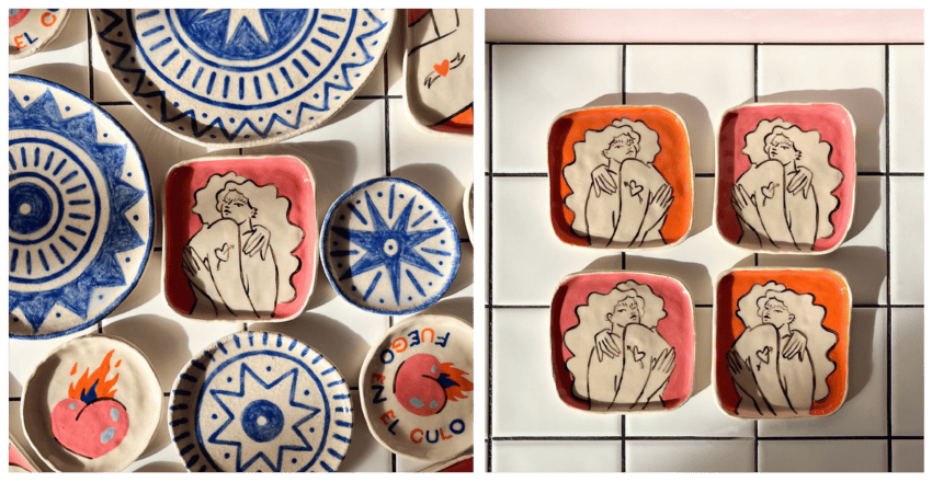 I think it all came from illustration. Animation, for example, was like this: “Okay, if I have an illustration, I want it to move.” I learned the basics, though I’m not the most amazing animator, but I developed my technique. With ceramics, something similar happened. I started during the pandemic because I wanted to get away from screens. At first, I thought, “It won’t be work, I don’t have to paint each piece.” But in the end, that’s what I liked, and I thought, “What if I put my illustrations on ceramics?” The tattoo thing was also something I had tried to learn before and gave up. Now I’ve picked it up again because I thought it would be really cool to put my drawings on people’s skin. It was a desire to do it all myself, to get out of the automatic mode and be a beginner at something.