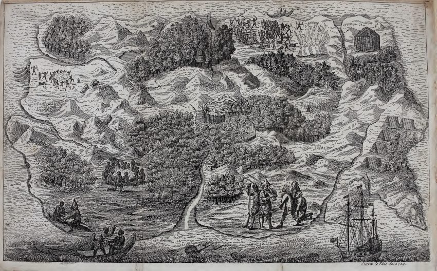 Pictorial map of Robinson Crusoe Island, the “Island of Despair” — a remote isle near the mouth of the Orinoco River in Venezuela.