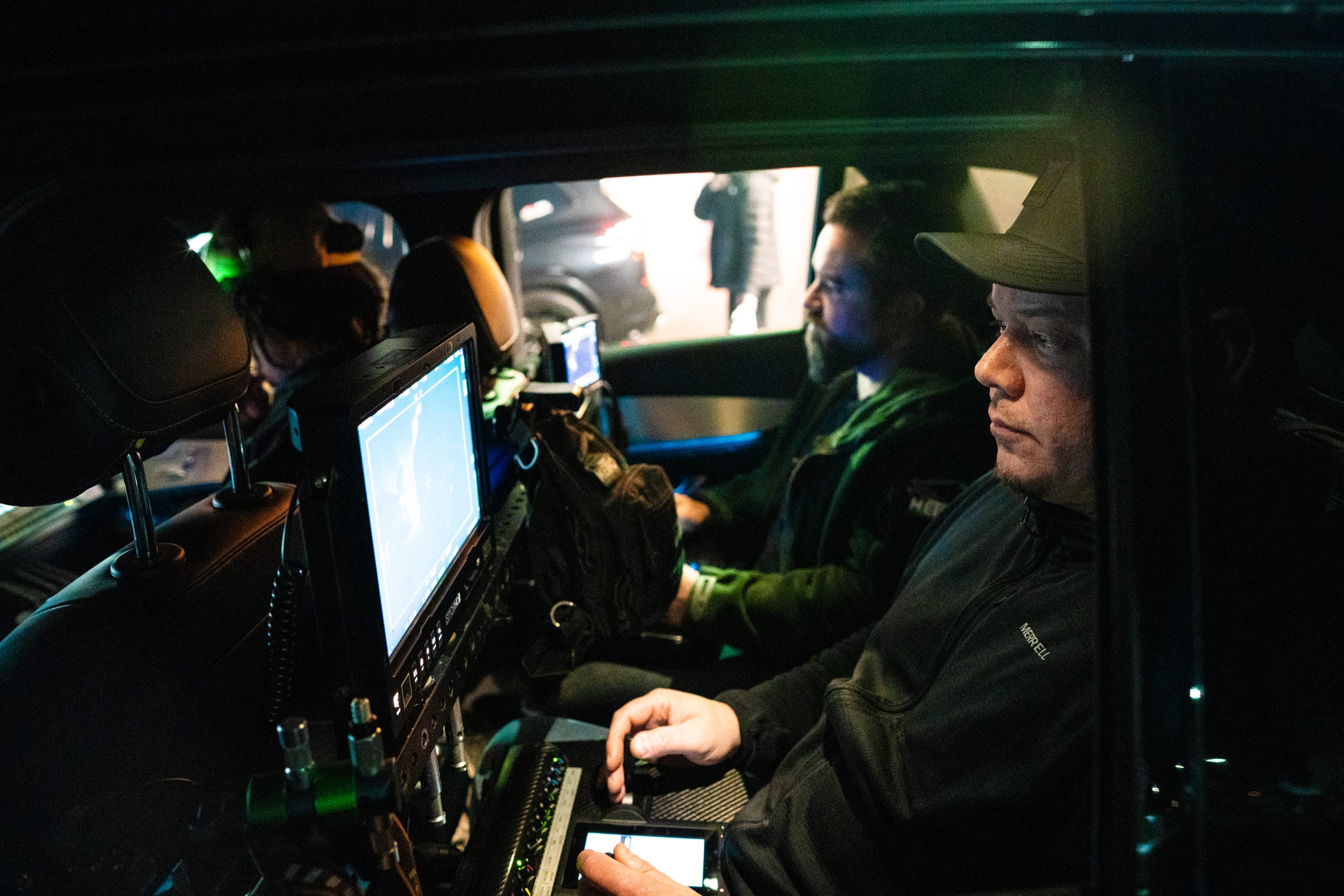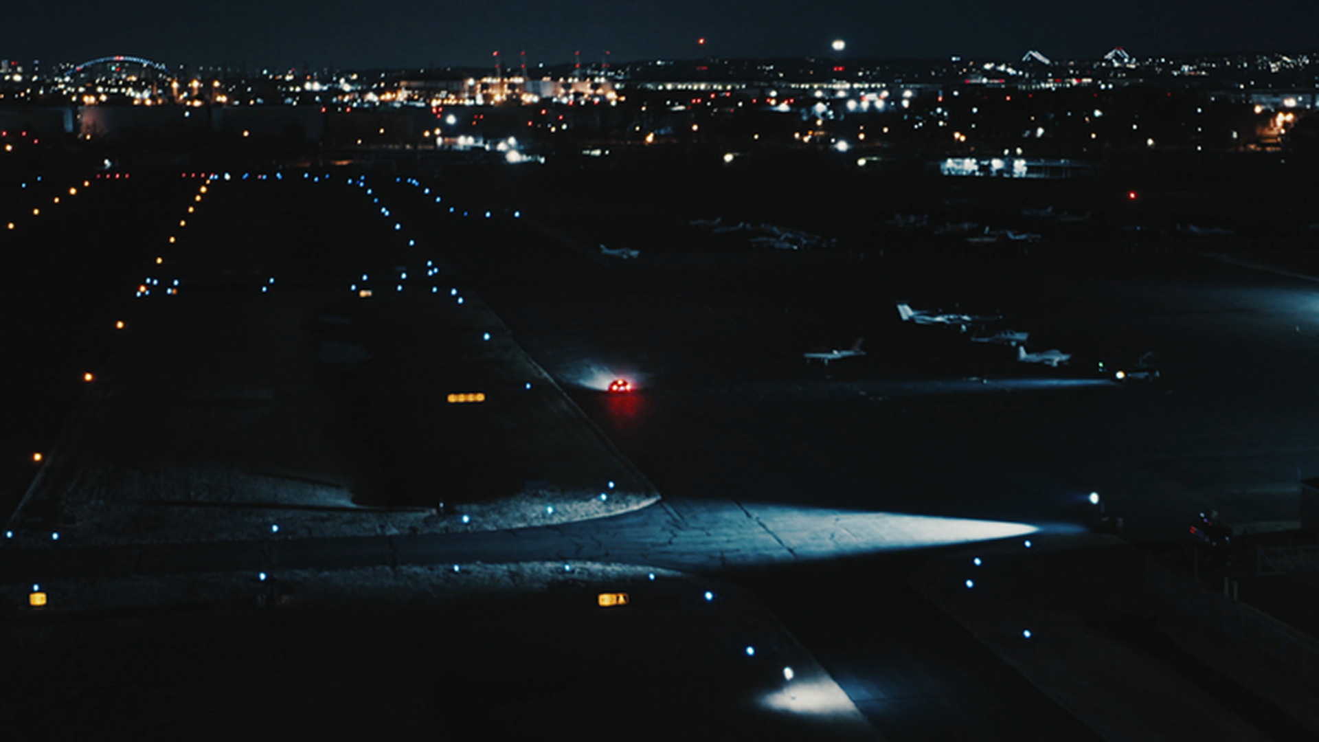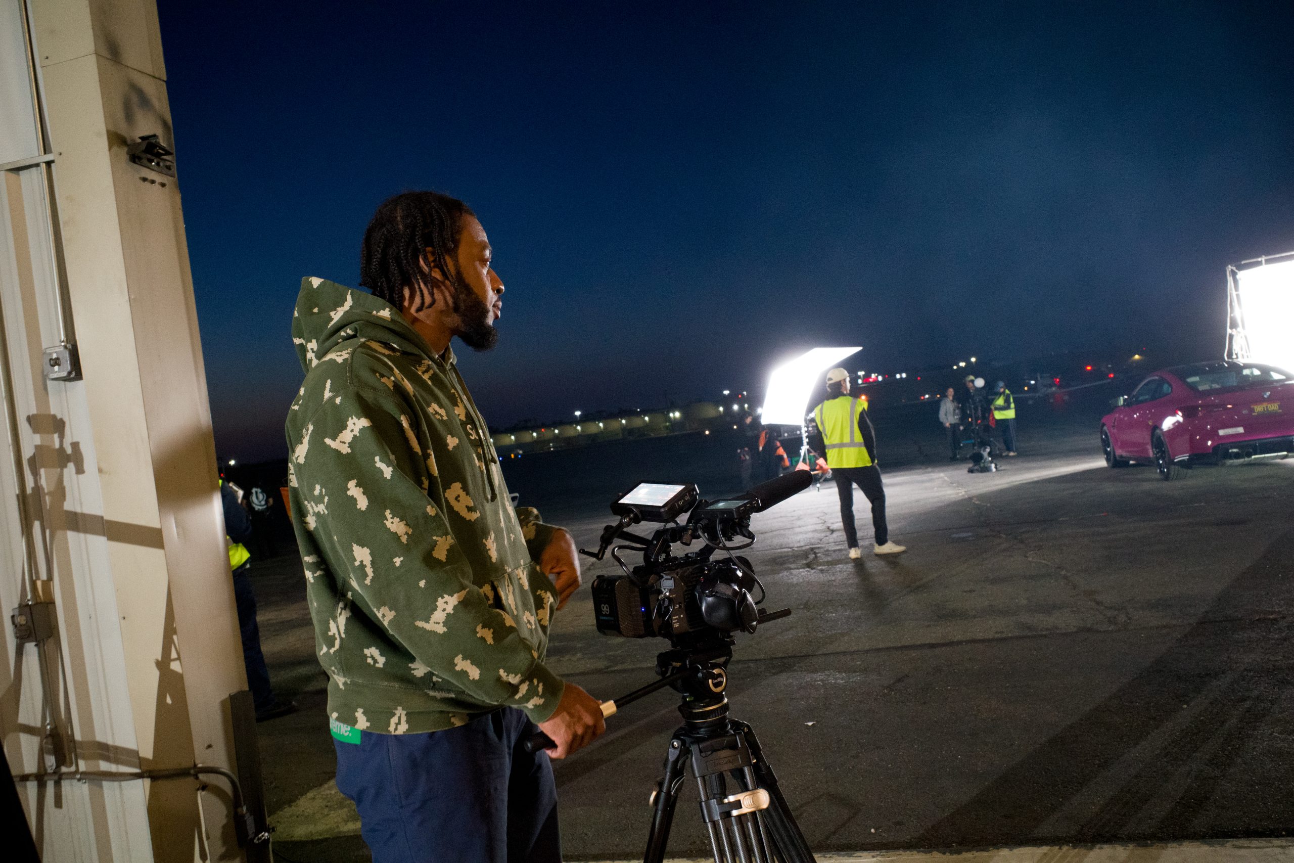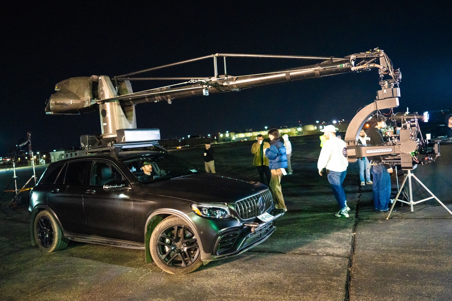 The production itself was a two-day sprint. Day one was the airport: an overnight shoot on the runway, the Russian arm car threading through picture cars, drifts and stunts choreographed by Casey Rutherford and Joey Bearse, FPV drones chasing BMWs past parked planes in the dark. Eric Wang, the drone operator, remembers pulling up, seeing the hangar and the arm car, and thinking he needed to bring out all the big toys. In the air they ran an Inspire 3 as the gimbaled drone and a RED Komodo on FPV for the racing scenes.