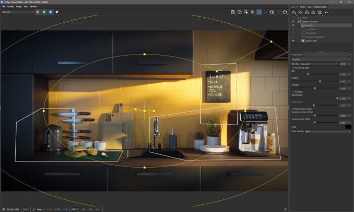 The V-Ray Frame Buffer (VFB) has been expanded to help users do more in one place. New custom-shaped render regions enable artists to render just one or many parts of their frame with custom-drawn shapes. A vignette layer camera effect is now included that can also be customized by shape. The VFB also gains new color-correction presetsthat help users quickly explore different looks as they refine their design.