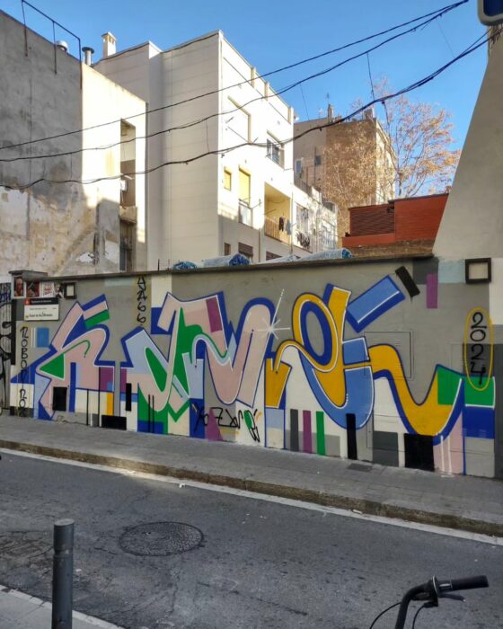 Graffiti piece by Martín Sawe, January 2024. This is a good example of graffiti presented in a legal format. Nowadays, big cities tend to let citizens freely paint in some spaces, like in this case, in the Gracia neighborhood of Barcelona.