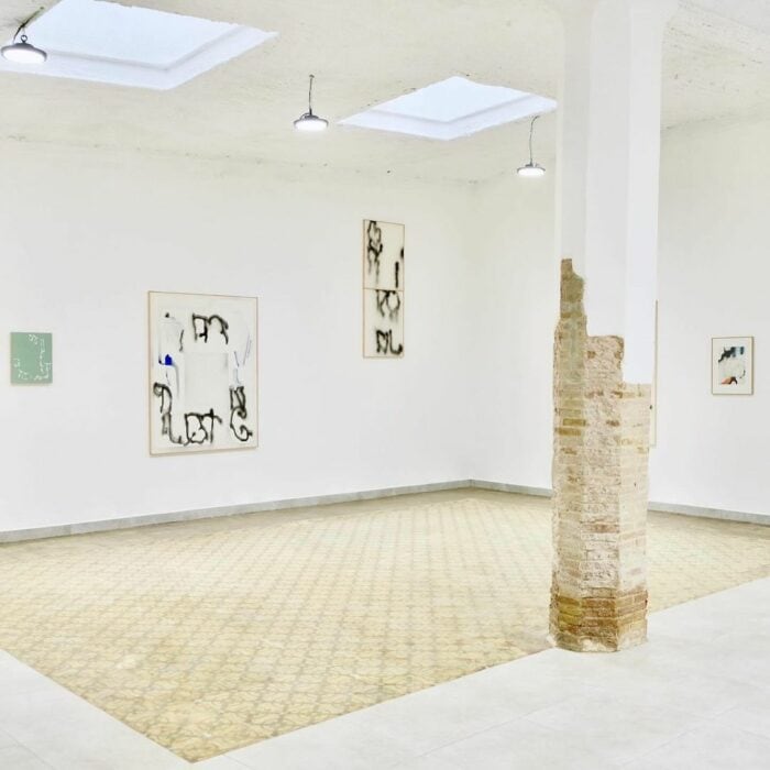 Installation view of Alsino Skowronnek’s art show »A Hard Problem« at Manifesto Barcelona, November 2023. Skowronnek’s work filters the practice of graffiti tagging into AI generated imagery which serves as the base of his minimal abstract paintings. Courtesy of the artist.