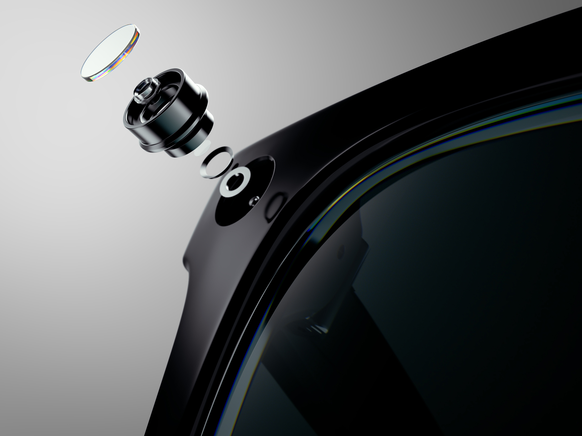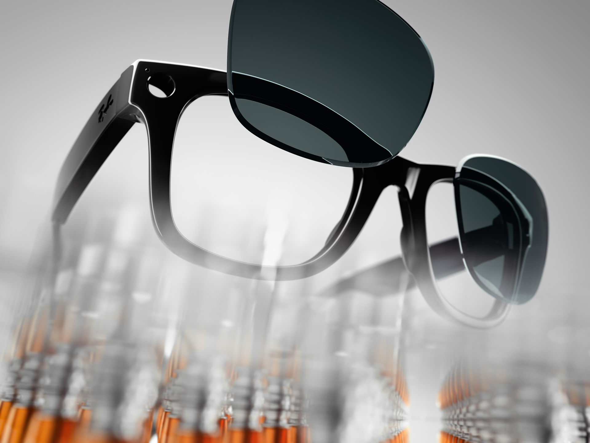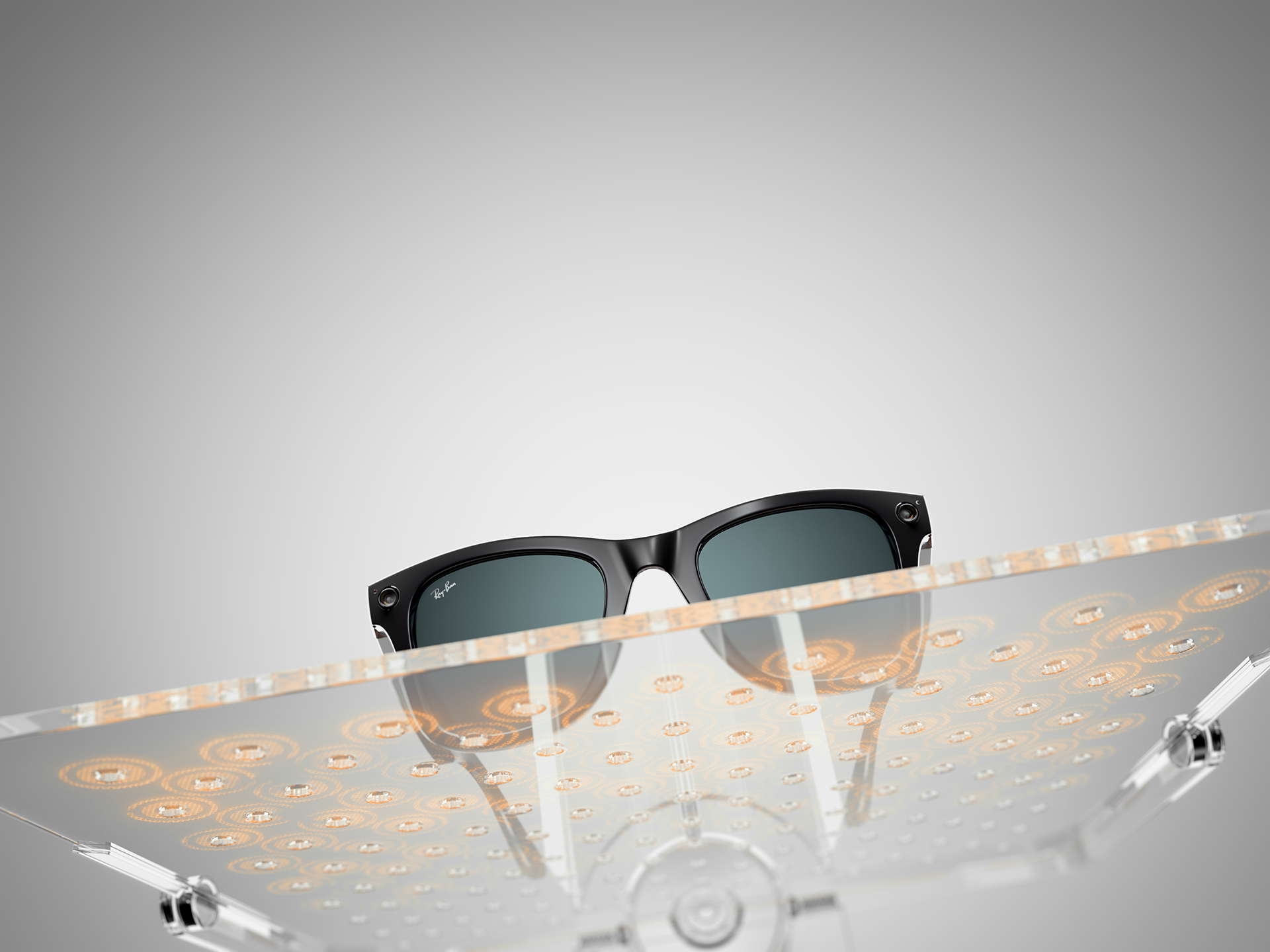 In the second chapter, we follow the build-up process of the Ray-Ban Meta Glasses. Data flows through translucent cables and transforms into dynamic particles. Beneath the signature Ray-Ban hood, these particles converge and assemble into the final product. The glasses have three main built-in features: cameras, speakers, and wireless data transfer. Each feature required a distinct visual language.